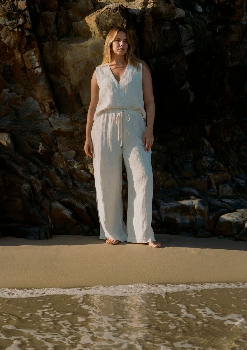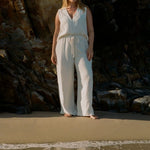 The Echo pant in ecru is a classic, summer wardrobe essential. Cut from a mid-weight textured linen fabrication, the Echo offers maximum comfort and everyday ease. Featuring relaxed fit, wide leg, drawstring waist and anchored elastic waistband that doesn’t twist. Perfectly paired with our Echo Sleeveless V-Neck Tank in Ecru.