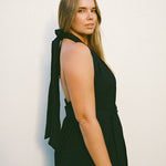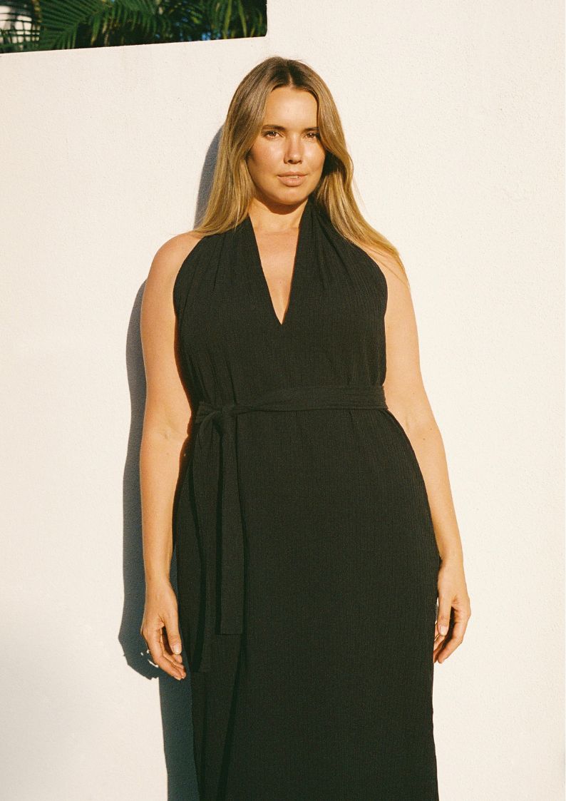 The Bettina is a minimal, black halter neck dress that blends elegance and comfort in a relaxed, feminine silhouette. Featuring a flattering plunge neck line, elasticated back panel and long halter ties that can be tied in multiple ways. Made from our signature lightweight textured cotton fabrication with slight stretch, this statement midi can be worn with belt for a cinched waist or worn without for a straight, smooth drape.